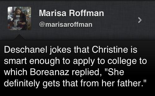 2:32 PM – Will Christine stay her age? They’re not planning on jumping forward. Deschanel jokes that Christine is smart enough to apply to college to which Boreanaz replied, “She definitely gets that from her father.”