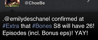 2:03 PM – “The stakes are higher,” Deschanel says of the new relationship between Booth and Brennan. “Now we’re responsible for a little human being.”